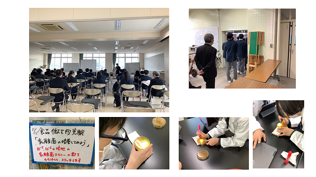 11月13日(木)、美唄東中学校2年生の学校訪問がありました。本校の特長や魅力や高校生活を生徒会執行委員から説明・紹介しました。中学生のみなさんは、フード系列3年次生の食品微生物実験「BCP加プレートカウント寒天培地による乳酸菌の培養」など各系列の授業や実習を見学しました。中学生の進路選択や志望校決定につながればと思います。