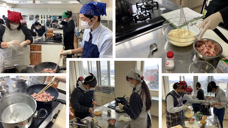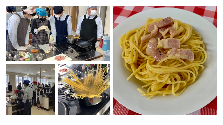 同じテーブルのメンバーと自然に役割分担をし、声を掛け合いながら協力して取り組む姿からは、これまでの実習で培ったチームワークの成長も感じられました。完成したカルボナーラを囲みながら、イタリアの食文化やパスタ料理の特徴についても学び、食を通して世界への関心を広げる機会となりました。