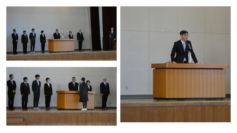 続いて行われた離任式では、離任される教職員一人ひとりから心のこもったメッセージが送られました。生徒を代表して生徒会執行部より花束が贈呈され、感謝の気持ちを伝える温かい時間となりました。なお、式の進行に関わる放送機器の操作は放送局の生徒が担当し、学校行事を支えました。