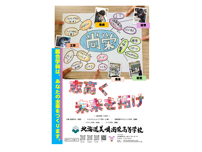 現在、本校では学校の魅力を伝えるポスター制作に取り組んでいます。訪問した中学校や公共施設に掲示された際に、思わず目に留まり、「どんな学校だろう」と興味をもってもらえるよう工夫しています。