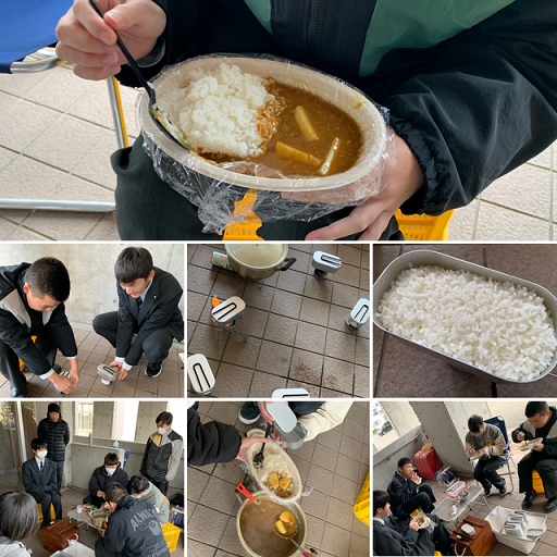 3年次生「総合的な探究の時間」防災チームは、災害時を想定した炊事でカレーライスをつくりました(具材や使える水の量[今回は3リットル]を限定)。野外は寒く、『温かい』食事も冷めてしまう環境を体験したことで、『日常生活が尊いもの』だと気付くことができました。