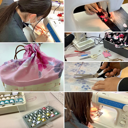 デザイン系列2年次生の授業『ライフデザインα』では、巾着袋の製作に取り組んでいます。巾着袋の下部はペーパークラフトでつくりました。生地選びや色合わせ、平面から立体へと仕上げる作業風景は、ファッションブランドのプロダクトデザインの工程を感じさせます。