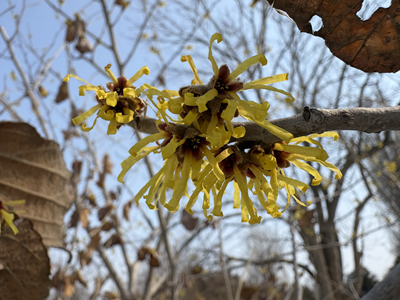 マンサク科マンサク属 シナマンサク 中国原産。幼条や葉が軟毛で覆われている。花は香りも強く黄金色。開花時に枯れ葉が残っているのが特徴。
