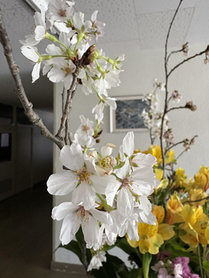 入学式の飾り花の桜が職員玄関で咲いています。