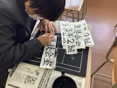 11月8日の記事「生活に生きる書 教室名を作成」で投稿しておりますが、「教室名を筆文字で書いてみる」という生徒の発案により、管理職に向けたプレゼンが行われました。私たちはこういうことをしたいのです、という強いメッセージが、我々管理職にも伝わり、是非お願いします、ということになりました。その後の様子です。