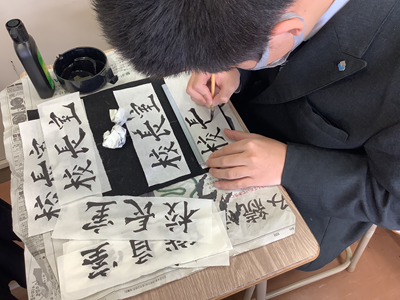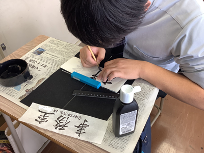 さて、熱心に筆を走らせる生徒が3名。書いて書いて書き続けている。ゴールは自らが納得したとき。完成ではなさそうですが、これだけ心を込めて丁寧に書かれたものならば、プレートが掲げられたときの重みを感じます。途中の過程を見ることができて本当に良かったと思いました。下の余白に自らの氏名が刻まれたプレートが校舎内に残るのっていいですよね。こんな素敵なプレートがある学校は日本中どこを探してもないのではないでしょうか。(写真の氏名は加工しております)