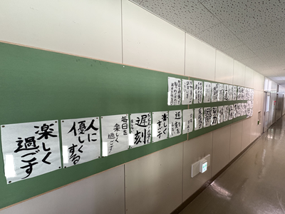 4階には1年次生のHR教室の他に書道教室があり、書道Ⅰ(1年次生の必履修科目)の授業で書いた作品をみんなが見られるように掲示されています。前に紹介しましたが、デザイン系列の作品展示やフード系列のメッセージボードなど、生徒の作品が校舎内の至る所で目にできるのは嬉しいです。また、仲間の作品を見ることにより、自らの良さや改善点等の気づきがあり、生徒の学びも深まります。